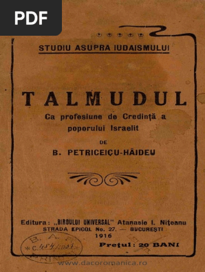 Voiam sa va vorbesc despre una dintre cele mai frumoase religii ale lumii, al carei fondator nu fusese o fictiune, un soldat, un preot, nu un dumnezeu, ci un. Of the jerusalem talmud, a basic work in jewish patristics. În viziunea sa, învățăturile talmudului sunt un adevărat îndreptar de comportament pentru membrii „poporului ales. Nu dispretui pe nimeni caci nu exista om care sa nu aiba un rost pe lume; Talmudul cartea sfanta a evreilor autor(i):