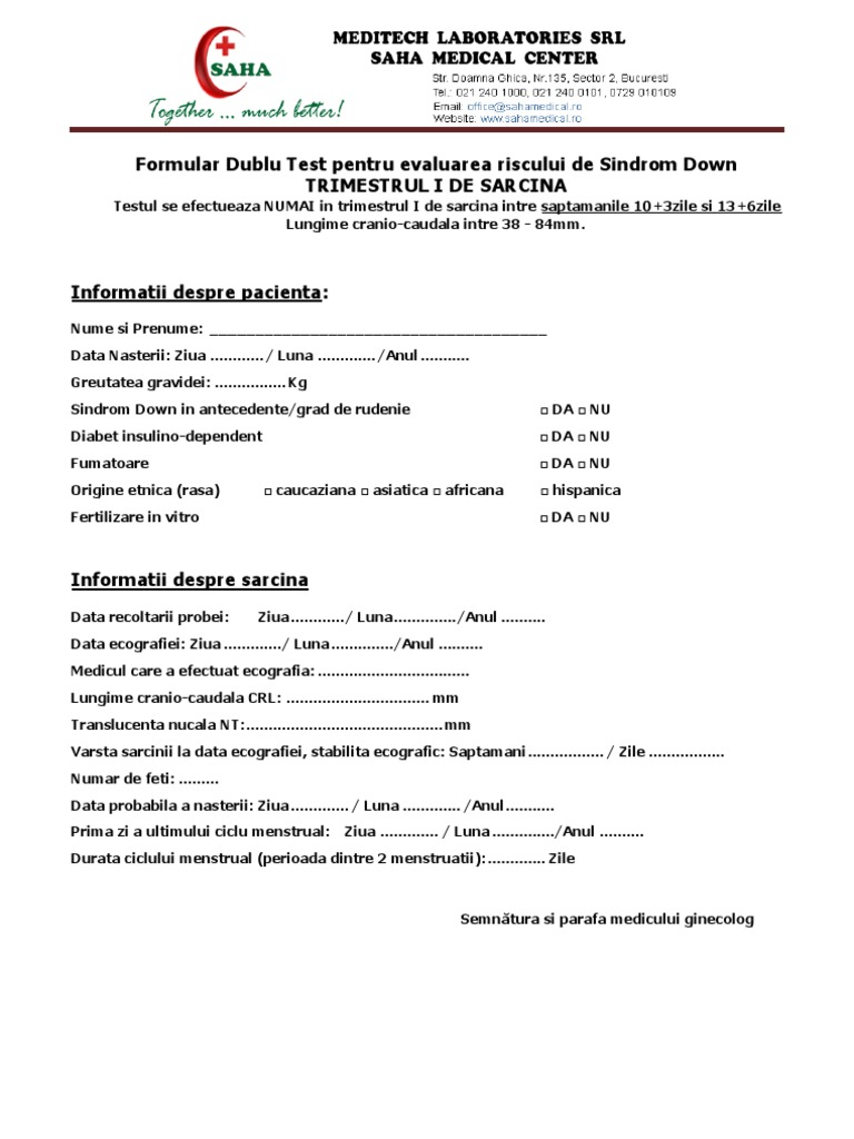 Dublu Test In Sarcina. Testul este folosit pentru descoperirea oricaror anormalitati cromozomiale ce pot aparea. Sarcina este o perioadă frumoasă în viața unei femei — 9 luni de emoții, așteptare și multă iubire pentru ființa din burtică. In primele 12 saptamani de sarcina se efectueaza diferite analize. Dublul test este un test de screening biochimic care se efectuează în primul trimestru de sarcină. Numita si screening prenatal de trimestrul i, aceasta metoda de investigare ajuta la depistarea celor mai grave si periculoase afectiuni si malformatii congenitale ale fatulului.