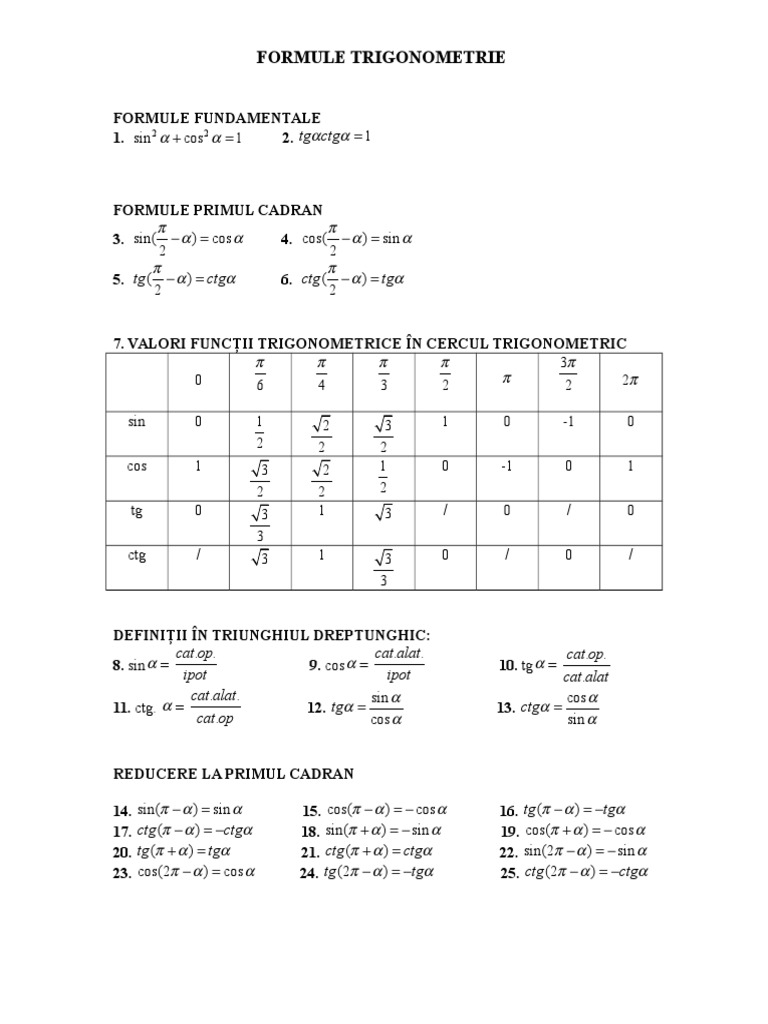 Formule trigonometrice pentru suma si diferenta Atunci când avem de calculat. În această pagină a ghidului | trigonometrie, intitulată simplu și sugestiv formule de reducere la primul cadran, vei găsi câteva formule cu ajutorul cărora putem calcula valorile funcțiilor trigonometrice pentru unghiuri care nu aparțin primului cadran al cercului trigonometric.
