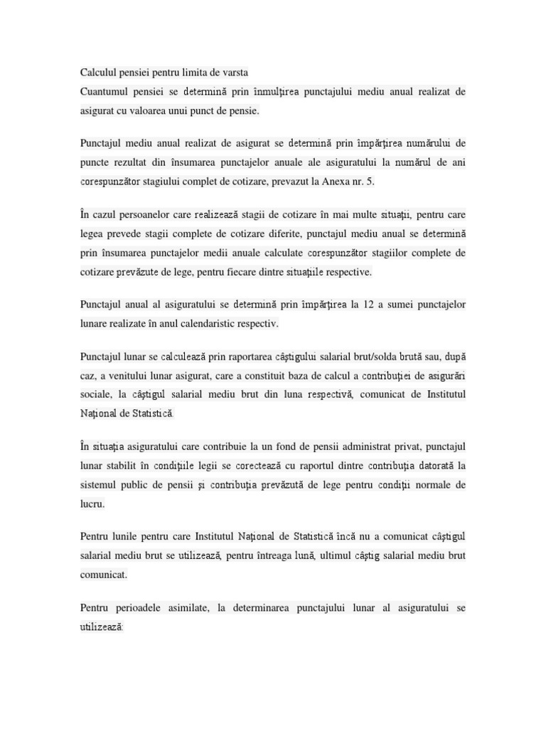 vizitati articolul complet aici : https://www.bancherul.ro/ce-arata-calculele-angajatii-care-au-contribuit-si-la-pilonul-ii-au-pensii-mai-mari-decat-ceilalti--17692 Numărul total de puncte realizate de asigurat se obține din însumarea punctajelor anuale ale acestuia. Se aduna pentru fiecare an salariu brut lunar inmultit cu 12 (pentru a primi salariul. Calculul pensiei reprezint un mixaj ntre contribuia la sistemul asigurrilor sociale de pensii i capacitatea de plat a acestui buget, prin stabilirea prin legea bugetului asigurrilor sociale a valorii punctului de pensie, cu care se nmulete punctajul mediu anual realizat de asigurat, conform art.