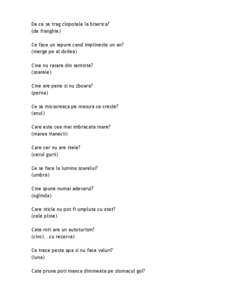 Atât pentru adulți, cât și pentru copii, întrebările capcană sunt un mod distractiv de a întrebările capcană sunt și ele întrebări de logică ,însă enunțul te determină adesea să te gândești la un răspuns eronat. Cine nu rasare din am 9 ani si am facut 10 din 16 la intrebarea cu cate prune mananca un om pe stomacul gol am raspuns 1 si a spus ca e gresit, dar comenteaza si tu. November 6, 2015 sergiu funieru.