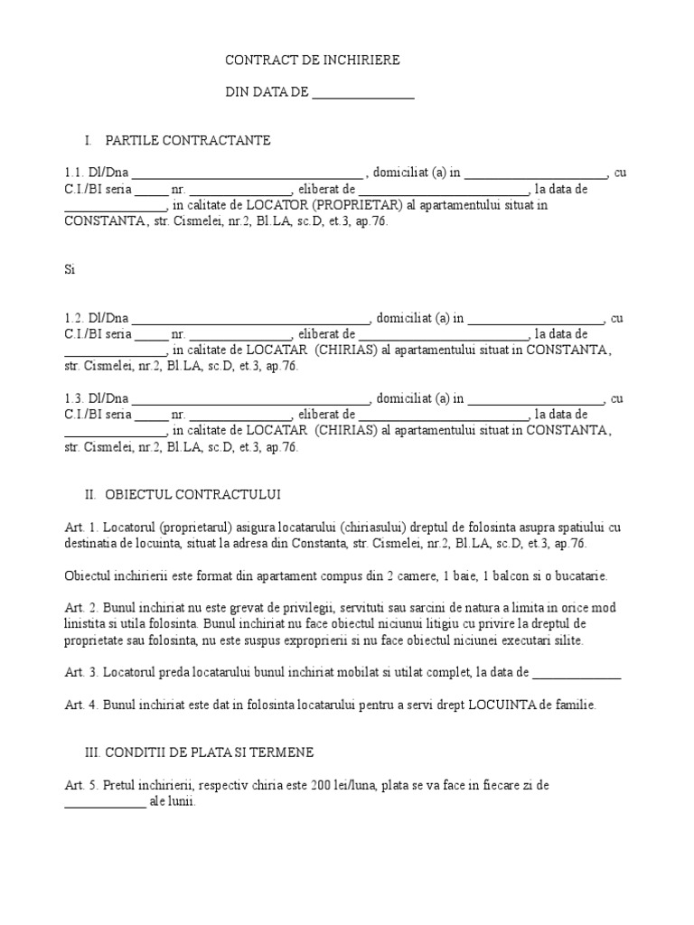 vizitati articolul complet aici : https://naugiferes.tistory.com/3 Download model de contract inchiriere imobil spatiu apartament model 3 download formular model de contract inchiriere imobil spatiu. Download formular model de contract inchiriere imobil spatiu apartament model in format pdf, wor doc Obiectul contractului îl constituie închirierea de către proprietar a spatiului comercial « ……….», situat în …………, cu o suprafata totala de ____ mp, conform schitei anexate, acordând chiriaşului un drept de folosinţă limitată în condiţiile prezentului contract.